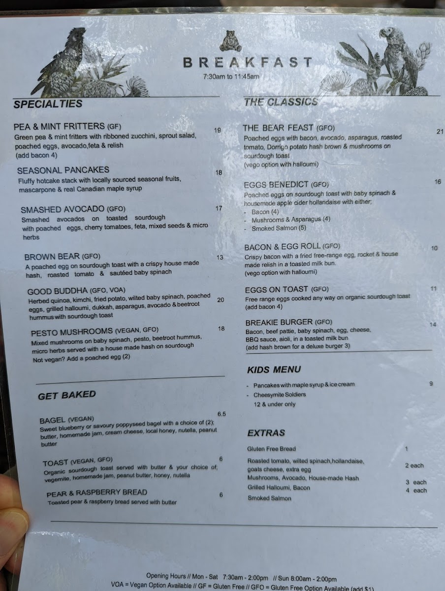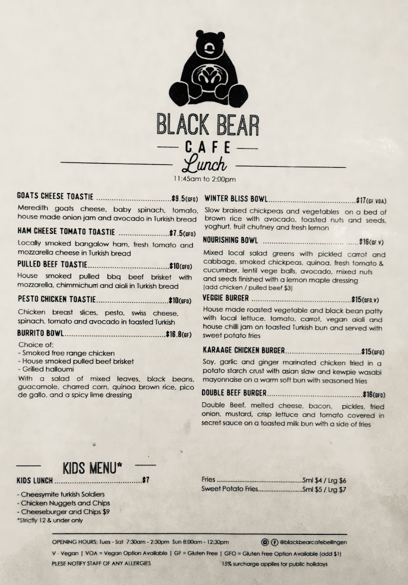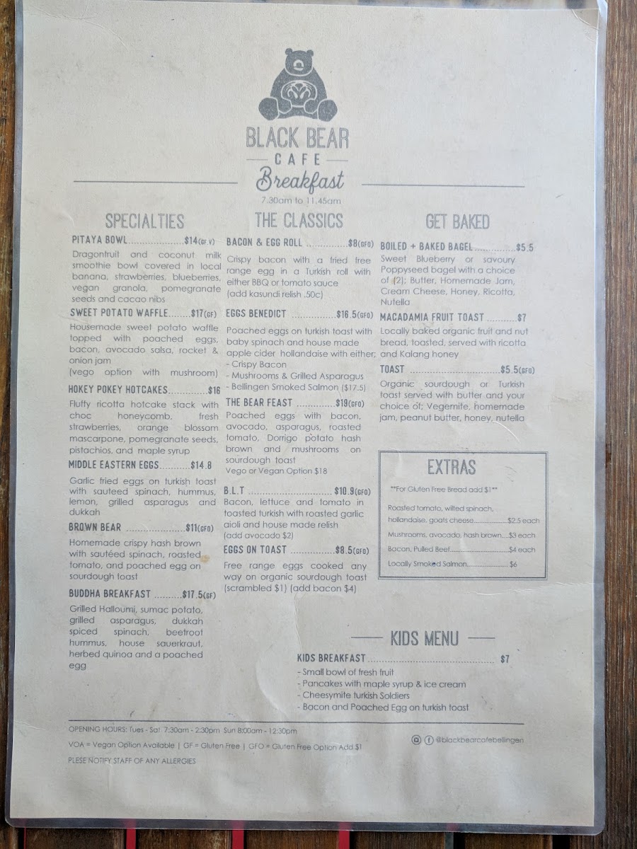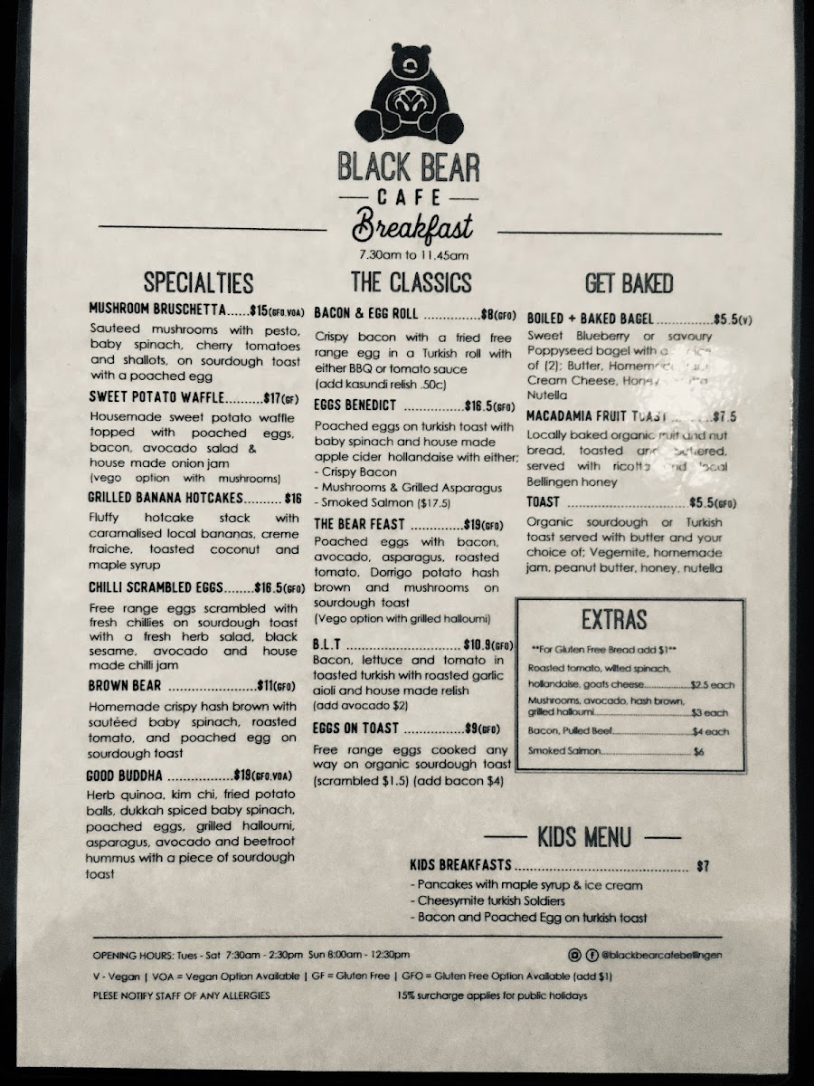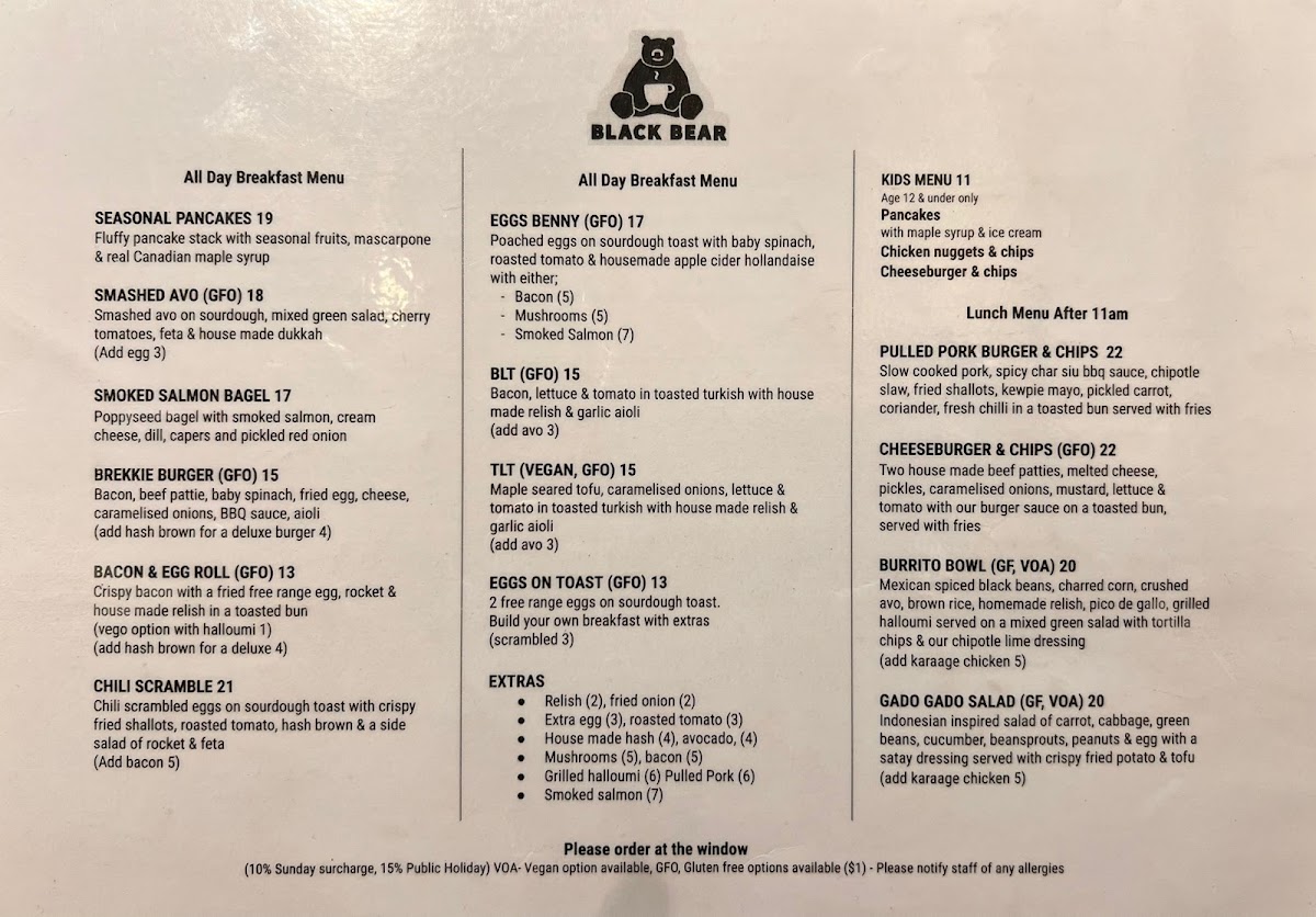 From a reviewer’s perspective, the menu at Black Bear offers a well-rounded and satisfying selection that balances creative specialties with comforting classics. Standout dishes like Pea & Mint Fritters, Seasonal Pancakes, Smashed Avocado Brown Bear, and Good Buddha showcase fresh ingredients and thoughtful combinations, while hearty options such as The Bear Feast, Eggs Benedict, Bacon & Egg Roll, Eggs On Toast, and Breakie Burger cater to those wanting a more traditional breakfast or brunch. The bakery-style offerings, including Pear & Raspberry Bread, Bagel, and Toast, provide lighter choices, and the kids’ options like Pancakes With Maple Syrup & Ice Cream and Cheesymite Soldiers make the menu family-friendly. Extras such as Gluten Free Bread, Roasted Tomato, Mushrooms, Avocado, House-Made Hash, Grilled Halloumi, Bacon, and Smoked Salmon allow for easy customization, while drinks like Berry Crush Frappe, Fresh Daily Juice, Sticky Chai, Iced Coffee, and Cold Brew round out the experience. Overall, the menu feels diverse, comforting, and well-suited to a relaxed café setting, leaving a positive final impression.