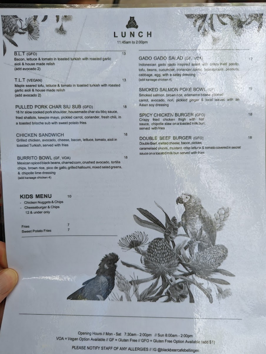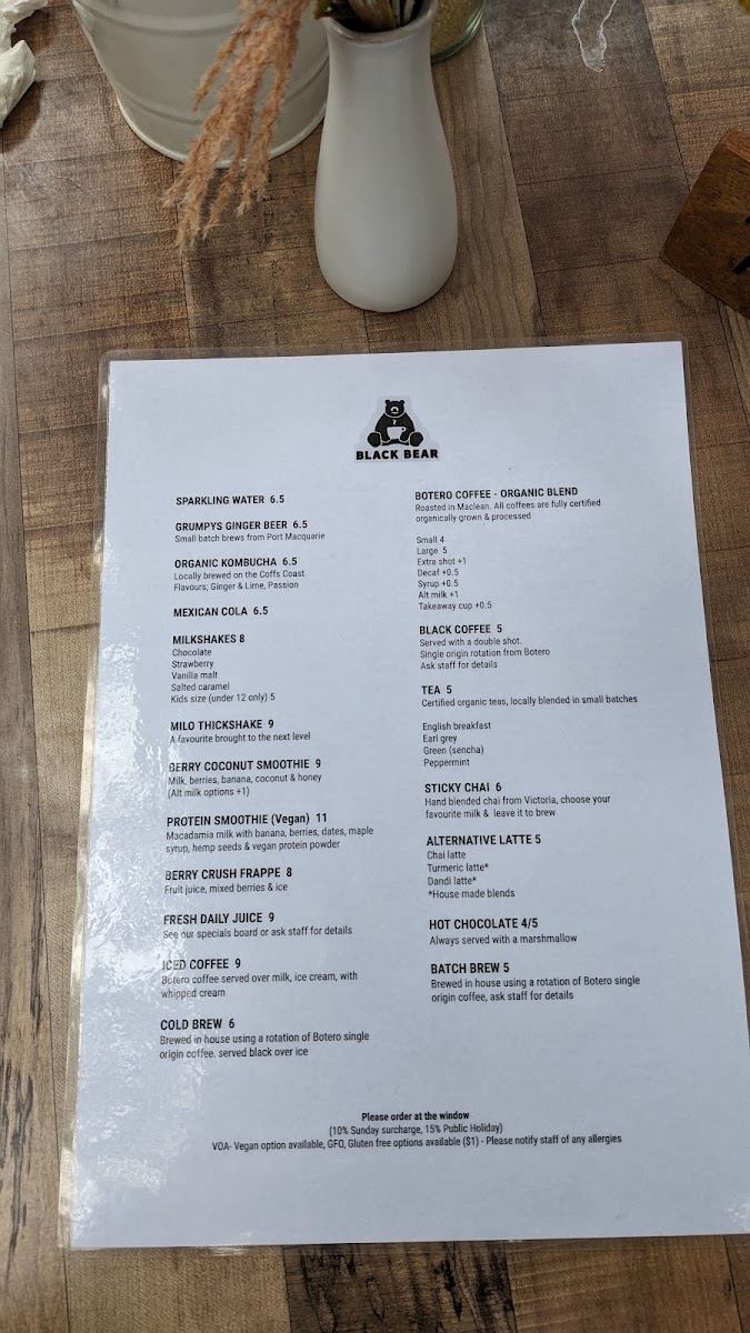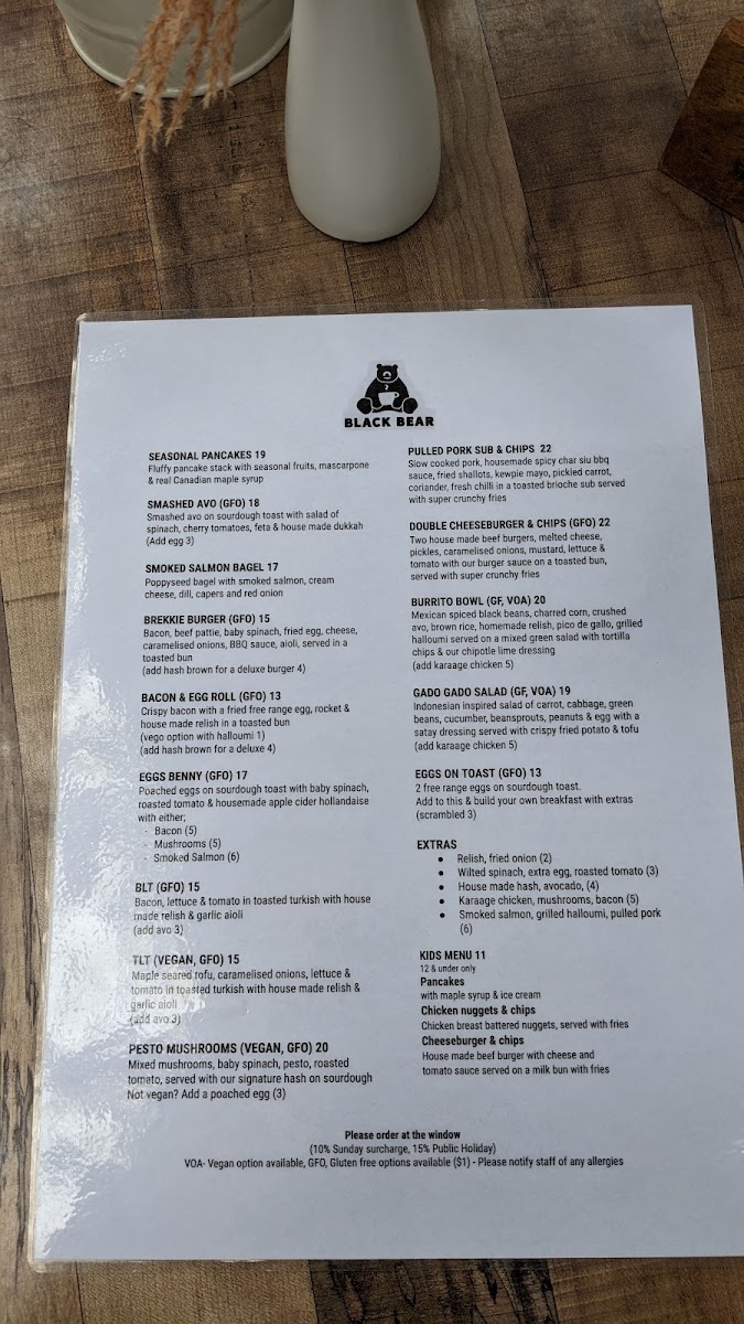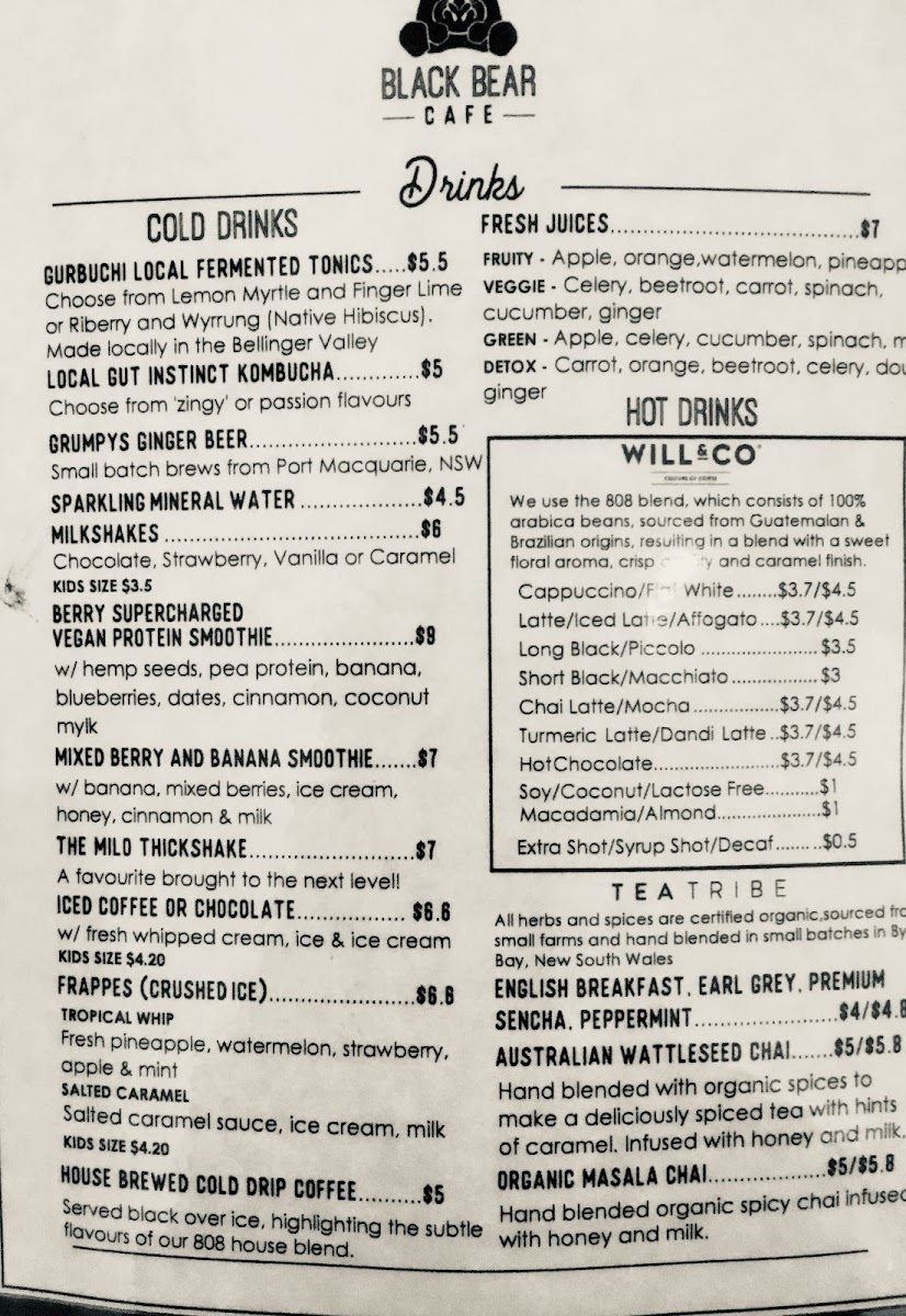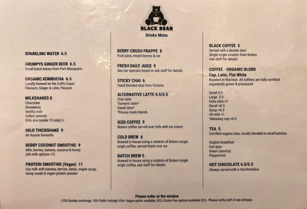 From a reviewer’s perspective, the menu at Black Bear offers a well-rounded and satisfying selection that balances creative specialties with comforting classics. Standout dishes like Pea & Mint Fritters, Seasonal Pancakes, Smashed Avocado Brown Bear, and Good Buddha showcase fresh ingredients and thoughtful combinations, while hearty options such as The Bear Feast, Eggs Benedict, Bacon & Egg Roll, Eggs On Toast, and Breakie Burger cater to those wanting a more traditional breakfast or brunch. The bakery-style offerings, including Pear & Raspberry Bread, Bagel, and Toast, provide lighter choices, and the kids’ options like Pancakes With Maple Syrup & Ice Cream and Cheesymite Soldiers make the menu family-friendly. Extras such as Gluten Free Bread, Roasted Tomato, Mushrooms, Avocado, House-Made Hash, Grilled Halloumi, Bacon, and Smoked Salmon allow for easy customization, while drinks like Berry Crush Frappe, Fresh Daily Juice, Sticky Chai, Iced Coffee, and Cold Brew round out the experience. Overall, the menu feels diverse, comforting, and well-suited to a relaxed café setting, leaving a positive final impression.
